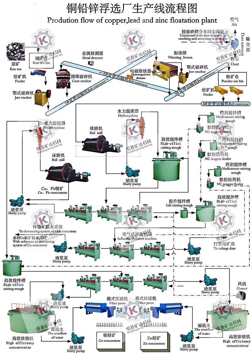 日处理100t/d铜矿选矿工艺设备流程图 Copper equipment with the capcity of 100t/d for extraction and technics flow chart