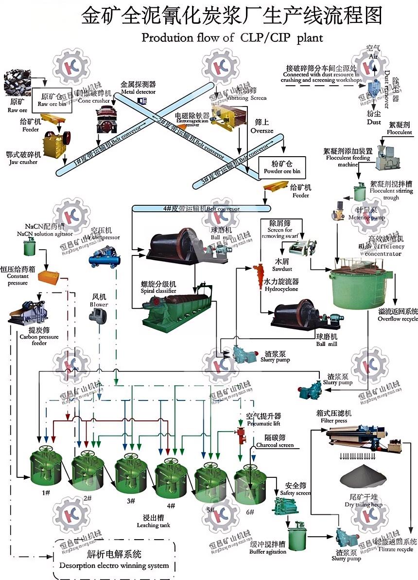 日处理1000t/d吨岩金矿(炭浆)工艺设备流程图 Ore gold equipment with the capcity of 1000t/d for extraction and technics flow chart